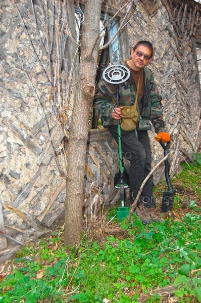 Мужчина с металлодетектором у полуразрушенного деревянного дома