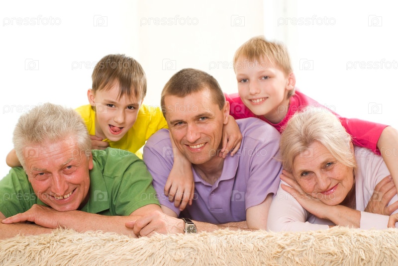 Портрет счастливой семьи из пяти человек на белом фоне