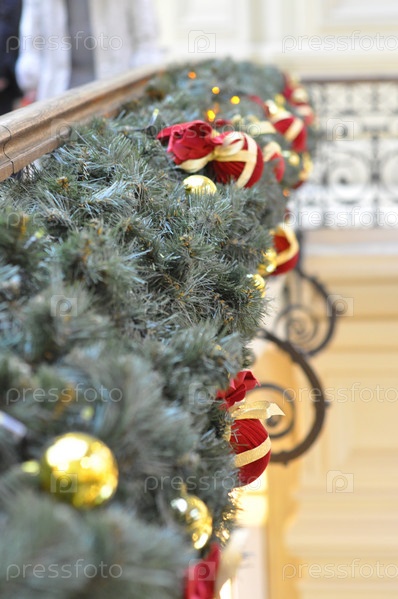 Гирлянда из еловых веток с елочными украшениями