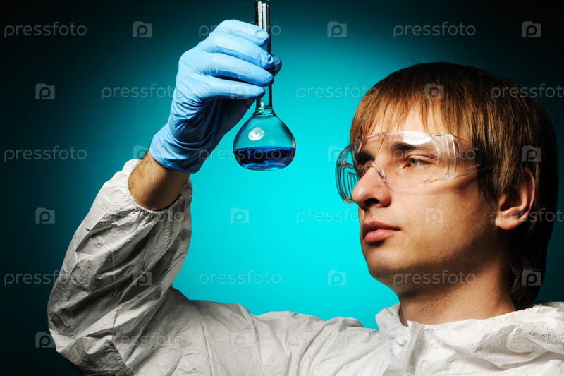 Ученый с колбой в защитной одежде и очках