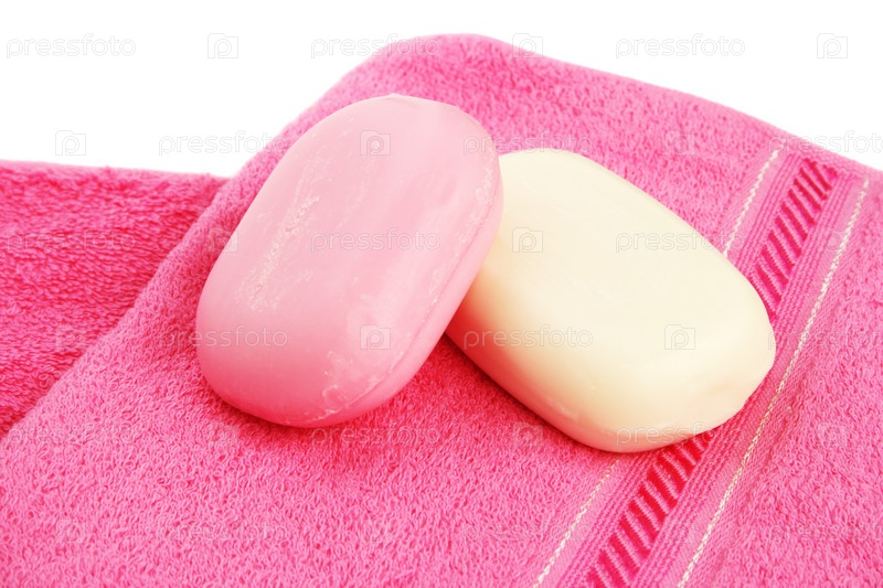 Полотенце и мыло, изолированные на белом фоне