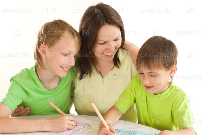 Молодая мама сидит за столом и рисует с сыновьями