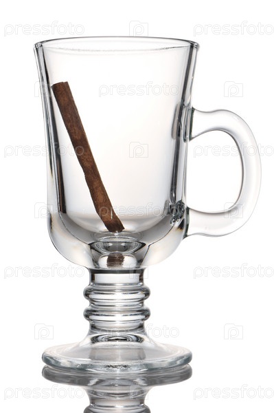 Стеклянная кружка для глинтвейна с палочкой корицы на белом фоне