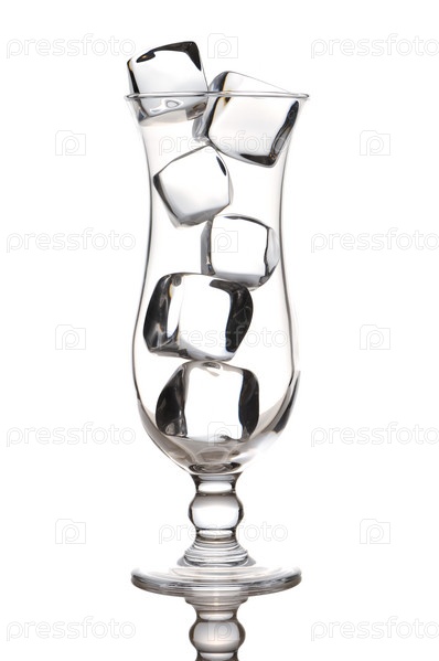 Стеклянный бокал с кубиками льда на белом фоне