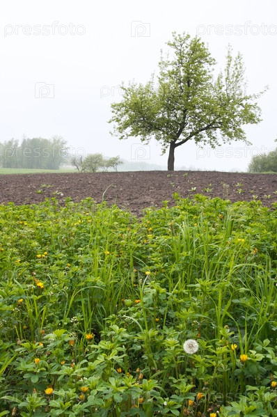 Туманное майское утро (свежие травы на переднем плане и одинокое дерево сзади)