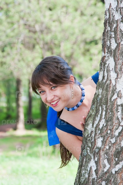 Девушка в синем платье у березы
