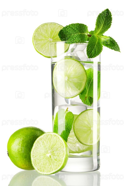Коктейль Мохито с лимоном и мятой крупным планом. Изолированный на белом фоне