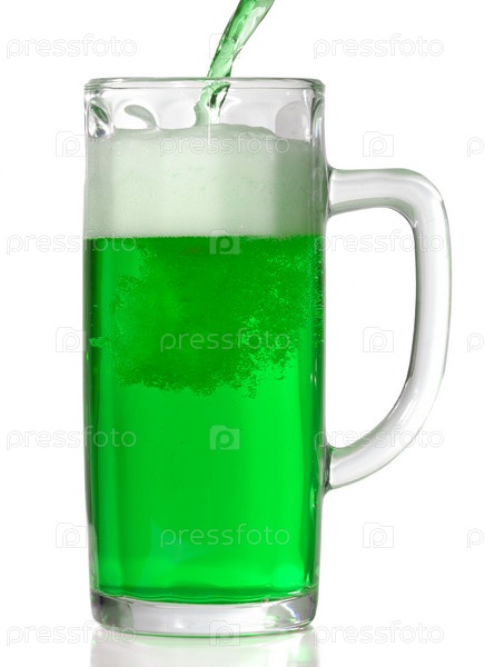 Зеленое пиво наливается в стеклянную кружку на белом фоне