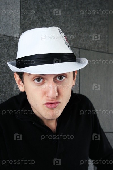 Молодой человек в белой шляпе и черной рубашке на фоне стены