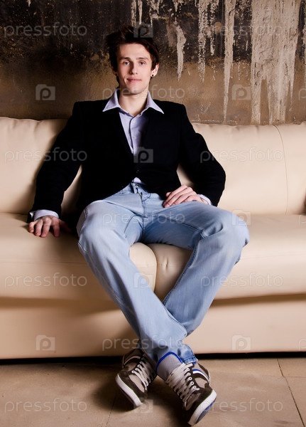 Стильный парень на белом диване