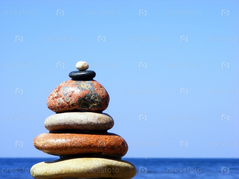 Пирамида из камней на фоне моря и неба с линией горизонта в солнце ясный безоблачный день