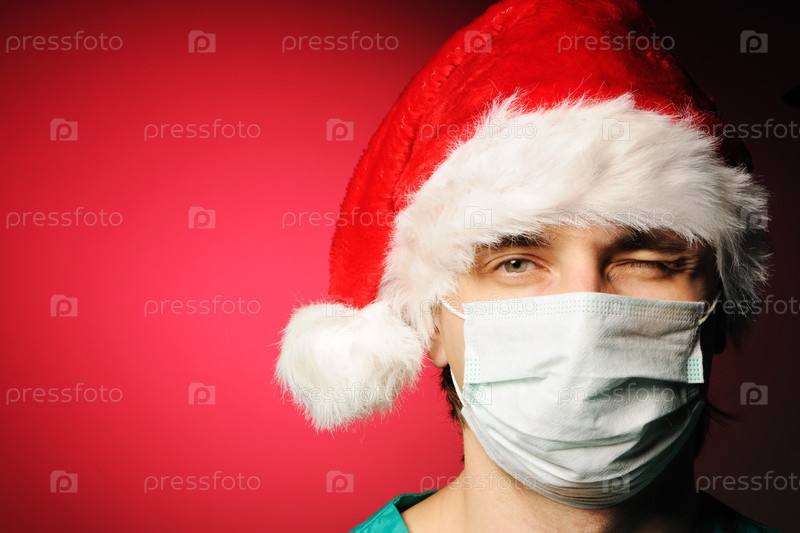 Хирург с маской в шапке Санта Клауса подмигивает на красном фоне
