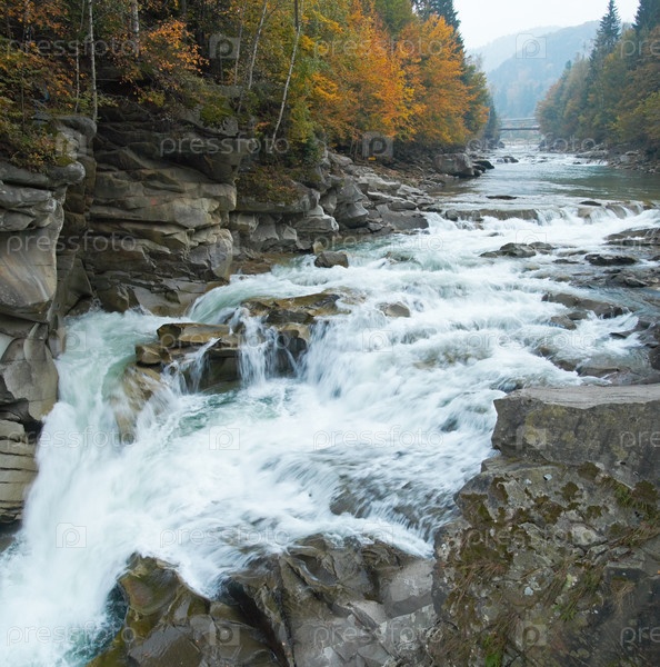 Вид на осеннюю горную реку с водопадом и мостом (Украина, Яремча). Общая картина два кадра