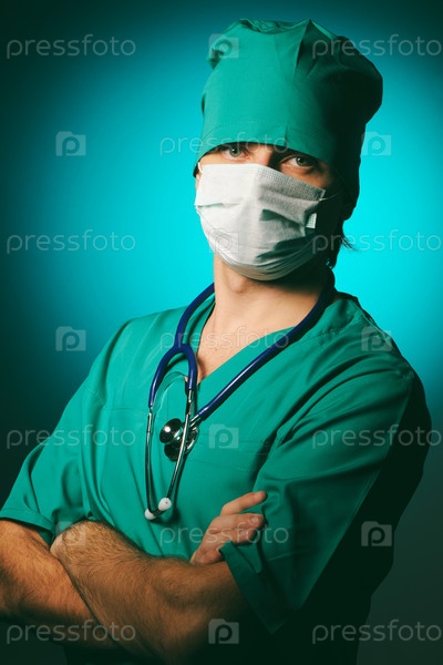 Хирург со стетоскопом и в маске на синем фоне