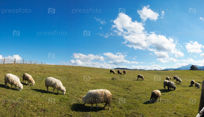 Стадо овец пасется на горном плато(Карпатские горы, Украина). В противоположном направлении солнечного света. Пять кадров