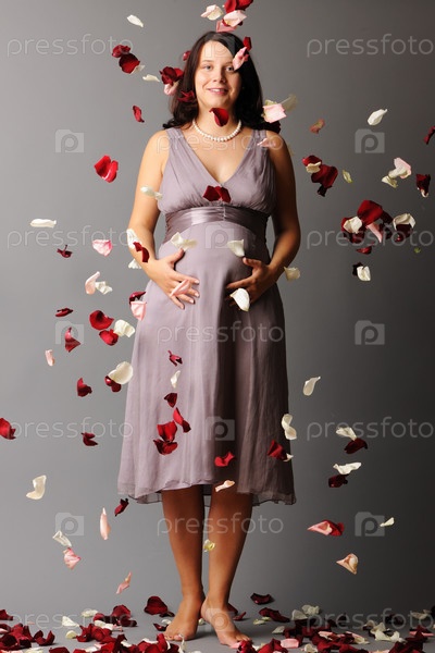 Портрет беременной женщины с падающими лепестками роз
