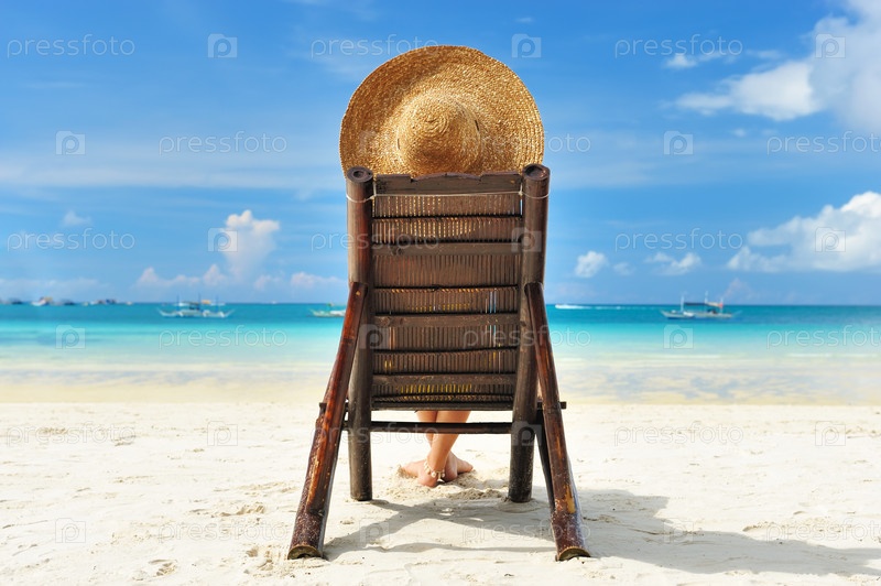 Девушка на тропическом пляже со шляпой