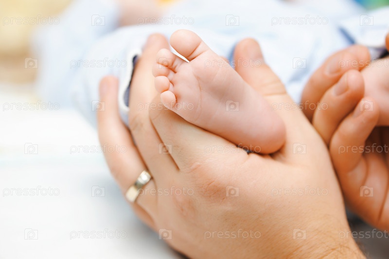 Нога маленького ребенка в руках отца