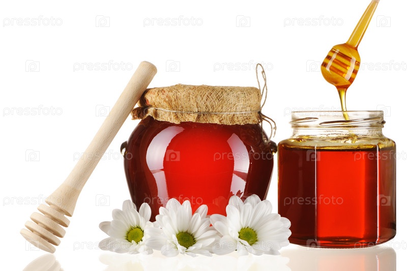 Две банки меда на белом фоне