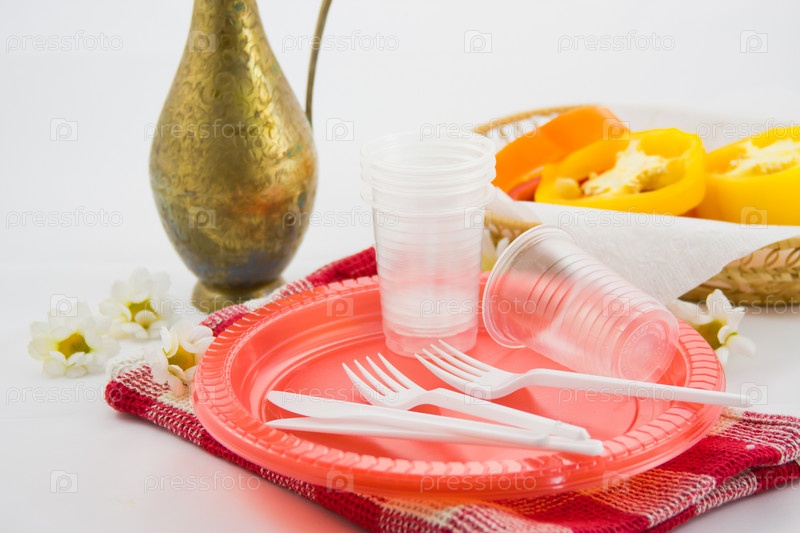 Кувшин, одноразовая посуда и нарезанные овощи в корзинке