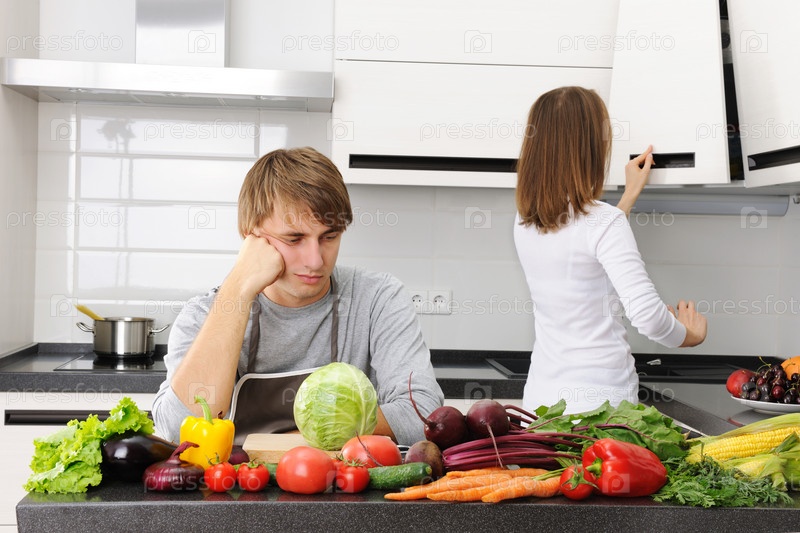 Молодая пара готовит на кухне