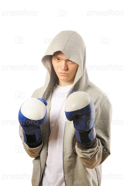 Молодой боксер в перчатках, на белом фоне