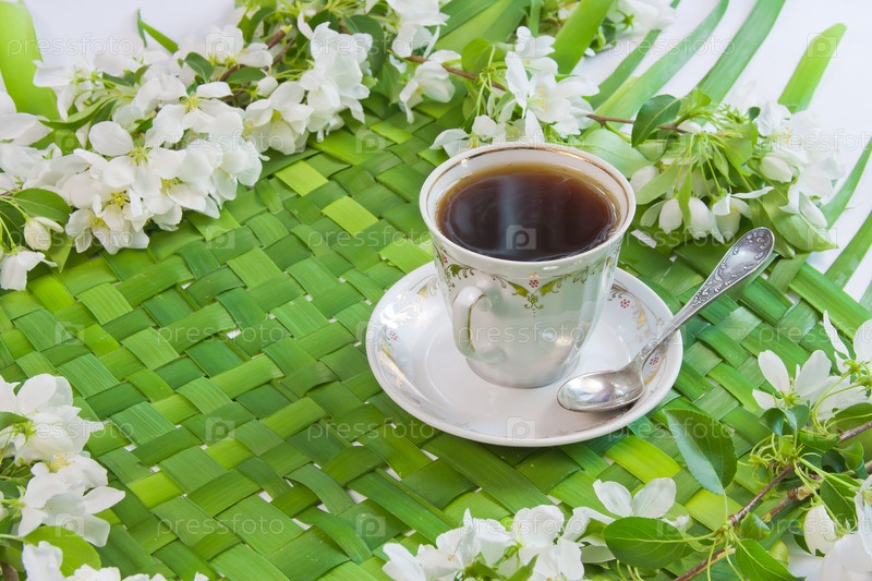 Чашка кофе с цветами яблони