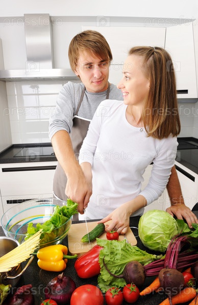 Пара готовит еду на кухне