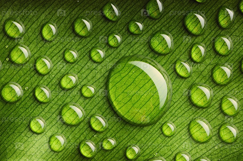 Красивые капли воды на зеленом листе. Текстура