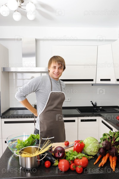 Счастливый молодой человек на современной кухне в процессе приготовления пищи