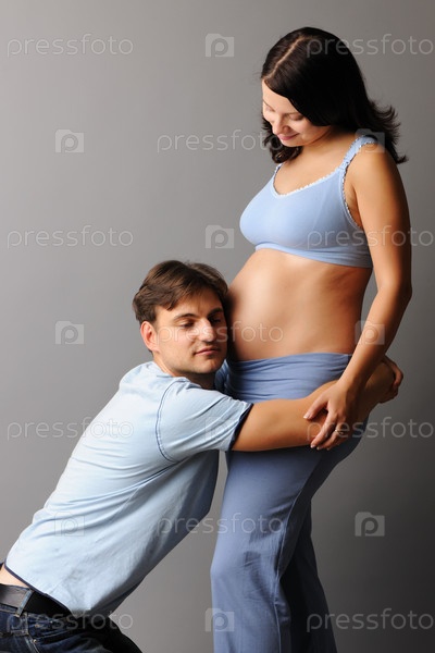 Отец будущего ребенка прижимается к животу жены
