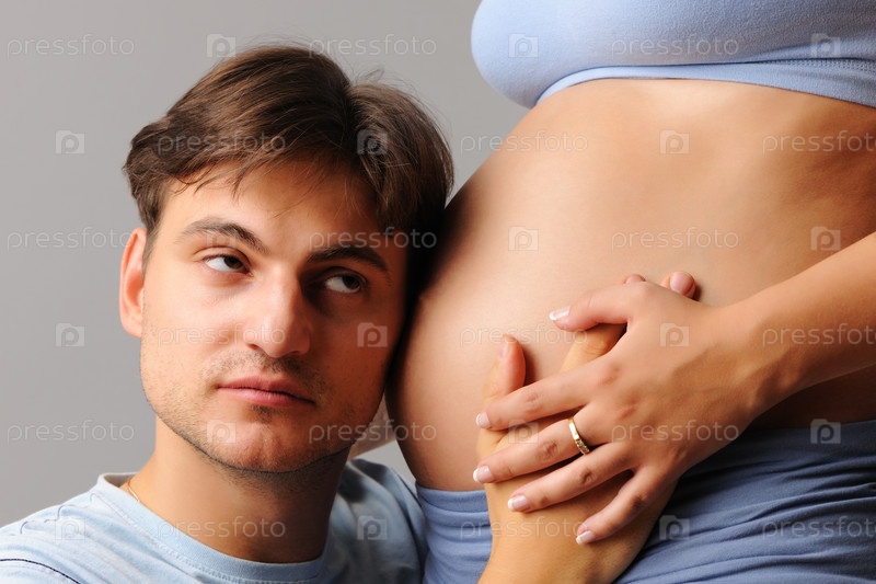 Отец будущего ребенка прижимается к животу жены