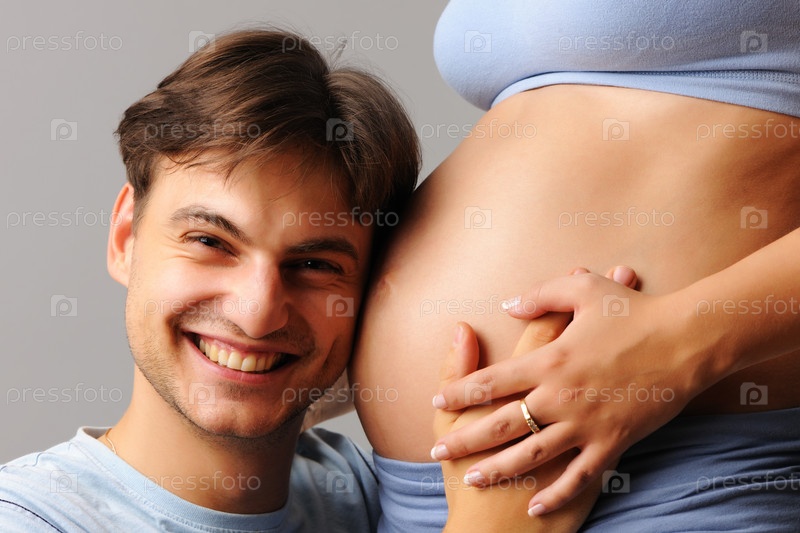 Отец будущего ребенка прижимается к животу жены