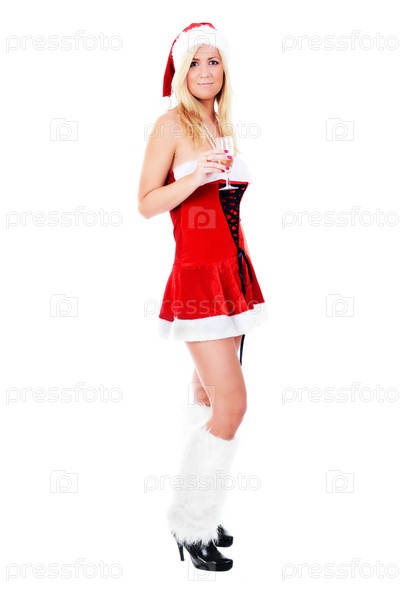 Светловолосая девушка в рождественском красном платье, белых пушистых гетрах и шляпе Санта Клауса с бокалом шампанского