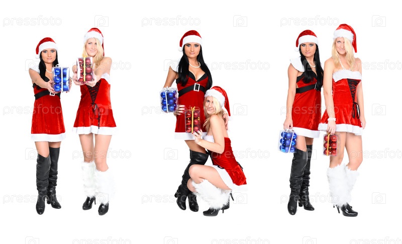 Две девушки в рождественских красных нарядах с коробками синих и красных елочных шаров. Набор из трех фотографий