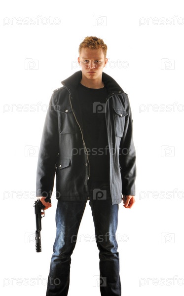 Мужчина с пистолетом на белом фоне