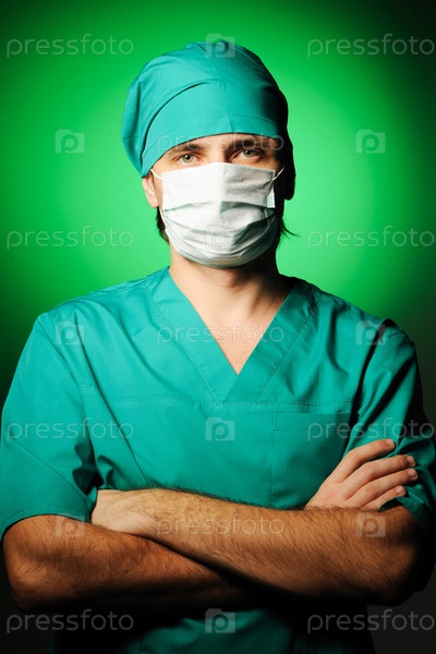 Хирург в маске на зеленом фоне