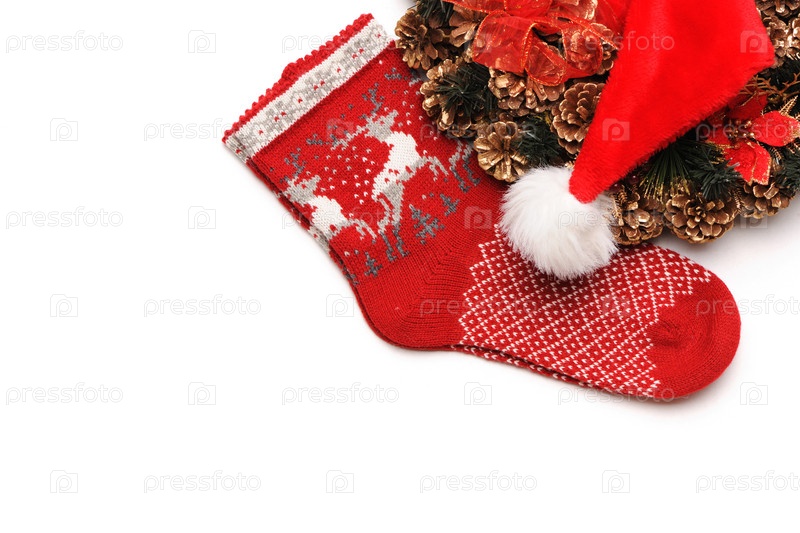 Рождественский венок, носок и колпак на белом фоне
