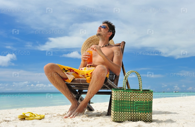 Молодой мужчина с коктейлем на тропическом пляже