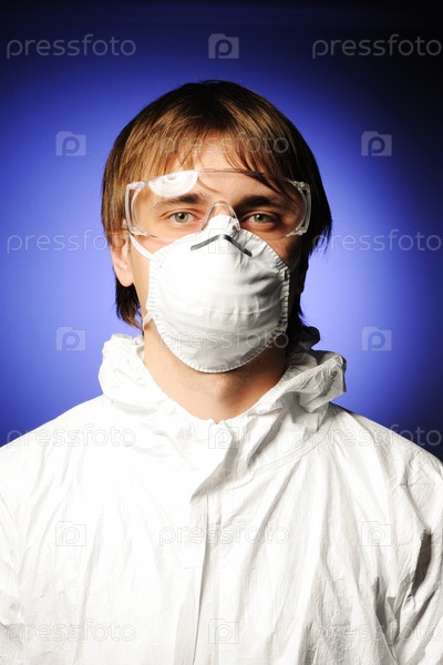Ученый в защитной одежде, очках и респираторе
