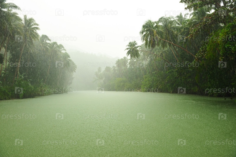 Тропический ливень над рекой
