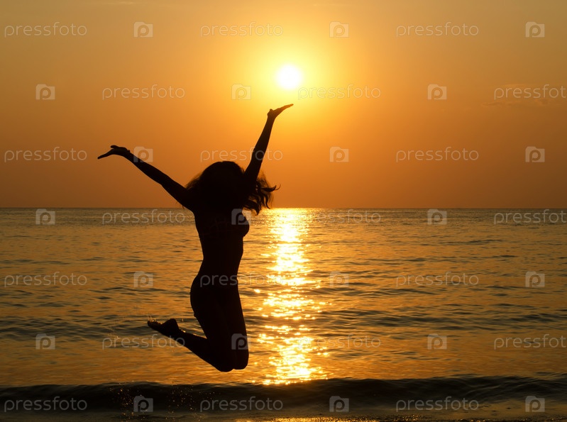 Силуэт девушки в прыжке на фоне заходящего солнца над морем