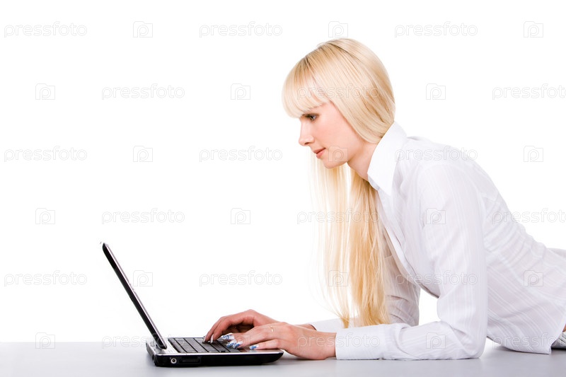 Изображение красивой женщины, лежащей перед ноутбуком и печатающей