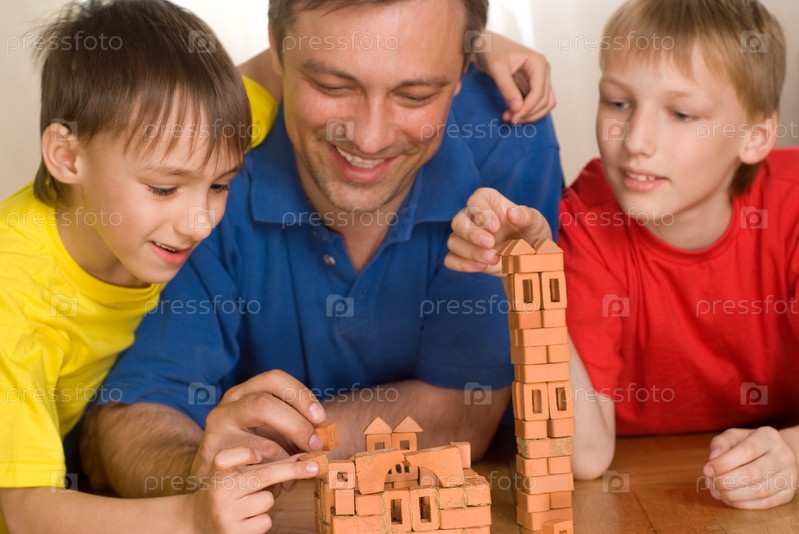 Счастливый отец играет с сыновьями на полу