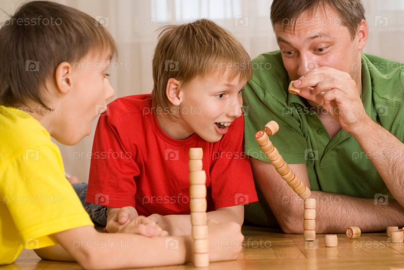 Счастливый отец играет с сыновьями на полу