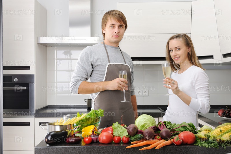 Молодая пара готовит еду на кухне