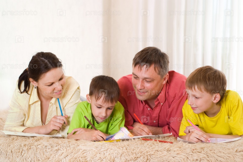 Счастливые родители рисуют с сыновьями, на ковре