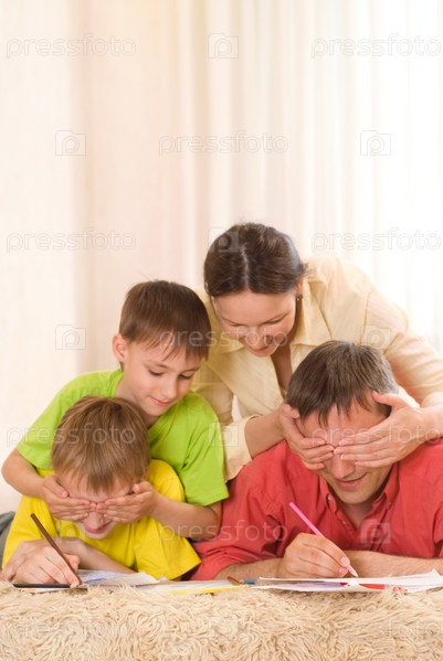 Семья за совместным досугом-рисованием, на ковре