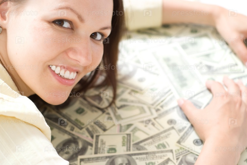 Счастливая женщина с кучей денег крупным планом
