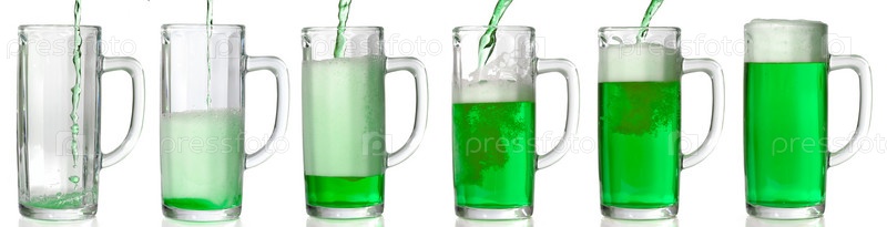 Зеленое пиво наливается в стеклянную кружку на белом фоне
